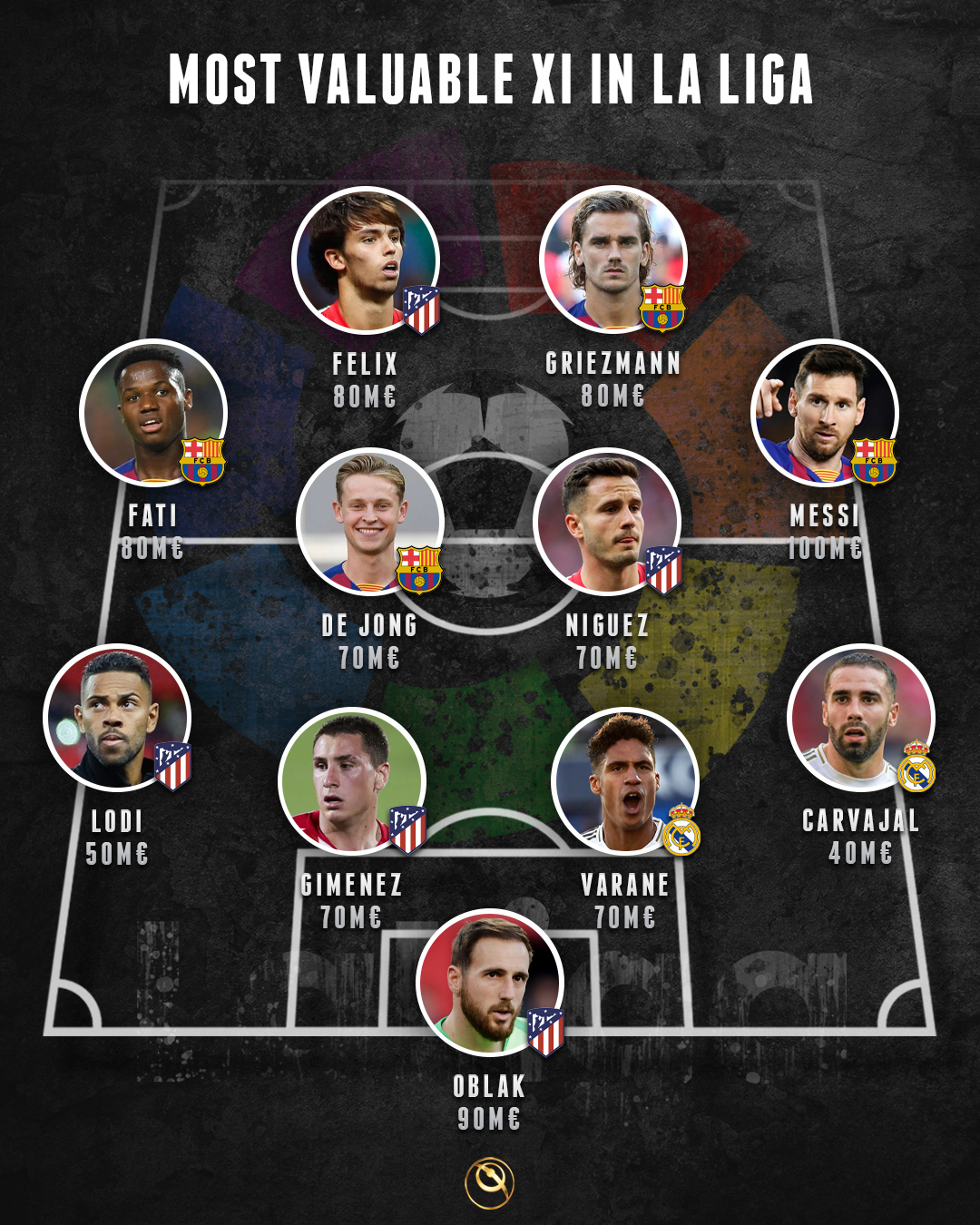 Globe Soccer Awards On Twitter The Most Valubale Xi In Laliga According To Transfermarkt Are You Surprised Joaofelix Griezmann Fati Dejong Niguez Messi Lodi Gimenez Varane Carvajal Oblak Https T Co 5u5s9qaj0c